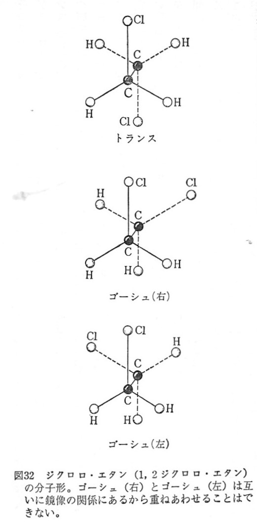 そのほかの実験法や理論的計算の結果から考えると、C‐C結合のまわりには自由回転はなく、ジクロロ・エタンのような分子は図32に示した二種の形に落ち着くことになる。その一つをトランス(trans) 、それから約120度の内部回転でできる形をゴーシュ(gauche) と名づけた。この研究はいろいろの高分子についても行ったが、何かの理由で研究がいきづまると、いつもジクロロ・エタンに帰ってまた考え直すことにしていた。それゆえ、この分子は、われわれの研究のベースキャンプみたいな基本体になったので、とくにそれをとりあげて図示したわけである。 (12行略)