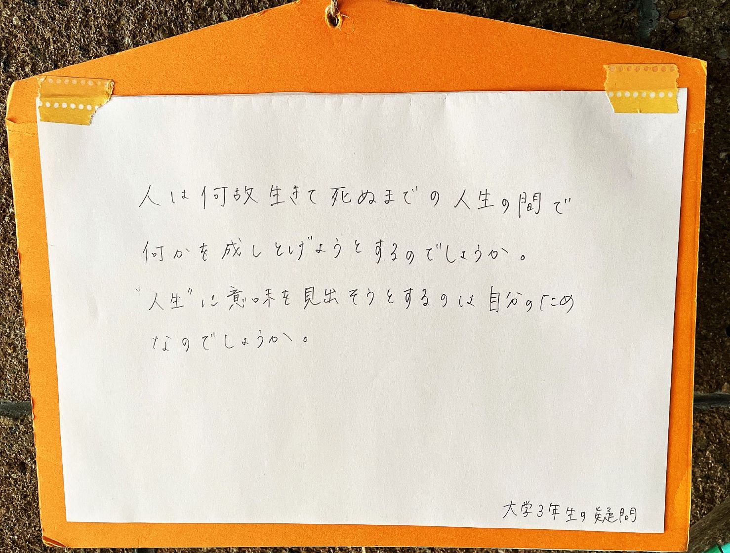 「人はなぜ生きて死ぬまでの人生の間で、何かを成し遂げようとするのでしょうか。人生に意味を見いだそうとするのは自分のためなのでしょうか」