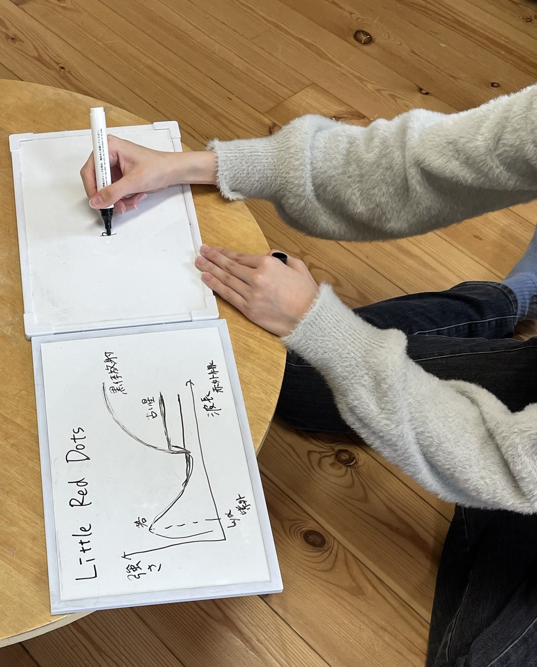 初期宇宙の研究をしている院生は、最近学術業界で話題になっている宇宙研究についてボードを使って説明してくれました。