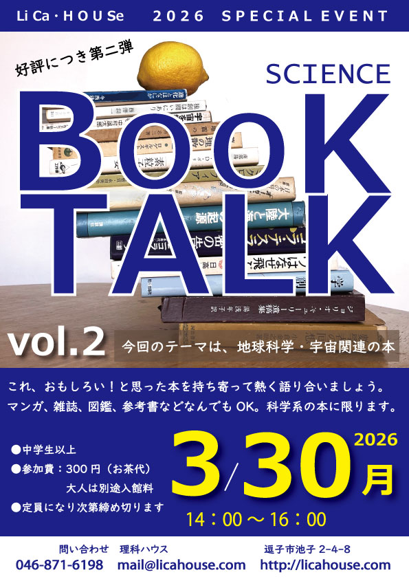 ●池子ドームでプラネタリウム/小6以上(小6は保護者同伴・要予約) --------------------------------------------------------------------------- ●理科ハウス生解説シリーズ/体験したい方は事前に予約してください(来館2回目以降・2名以上でお願いします) 量子力学のはじまりのはじまり/先に「原子のなかみ」を見てください(所要時間90分) 科学ジャーナリストの先駆者 石原純の一生について語ります(所要時間60分) NEW!生解説「新しい分類体系で楽しむ植物観察」要申込/中学生以上 DNA塩基配列による新しい分類体系APGを使って季節の植物を観察します(所要時間60分) 日本のノーベル物理学賞受賞者5人の研究について解説します(所要時間1時間30分~2時間 特殊相対論の式を使って計算します(所要時間90分) NEW! 生解説「電気と磁気のあやしい関係」要申込/中2以上 世界を驚かせた電磁気実験をそのまま再現します(所要時間1時間) 「笑わない数学」のモヤモヤを解消したい方に。素数と無限と虚数(所要時間90分) 分子結合について解説します(所要時間90分) 生解説「セントラルドグマ」要申込/「序」「破」「急」/高校生以上 <序>DNAはどんな働きをしているのかを解説をします(所要時間90分) <破>二重らせん構造発見物語を解説します(所要時間1時間) <急>日本人による遺伝にかかわる研究について解説します(所要時間1時間弱) 4次元の世界の入門編を解説します(所要時間1時間弱) 現地から採取した石を実際に触りながら三浦半島の地層がどのようにしてできたかを解説します(所要時間1時間30分~2時間) 生解説「三浦半島から恐竜の化石は出るのか」要申込/中学生以上 「三浦半島はどこからきたのか」の中学生版。グループ・団体向き(所要時間1時間30分) -------------------------------------------------------------------------------------------------- ●館内は乾燥しています。各自飲み物をご持参ください