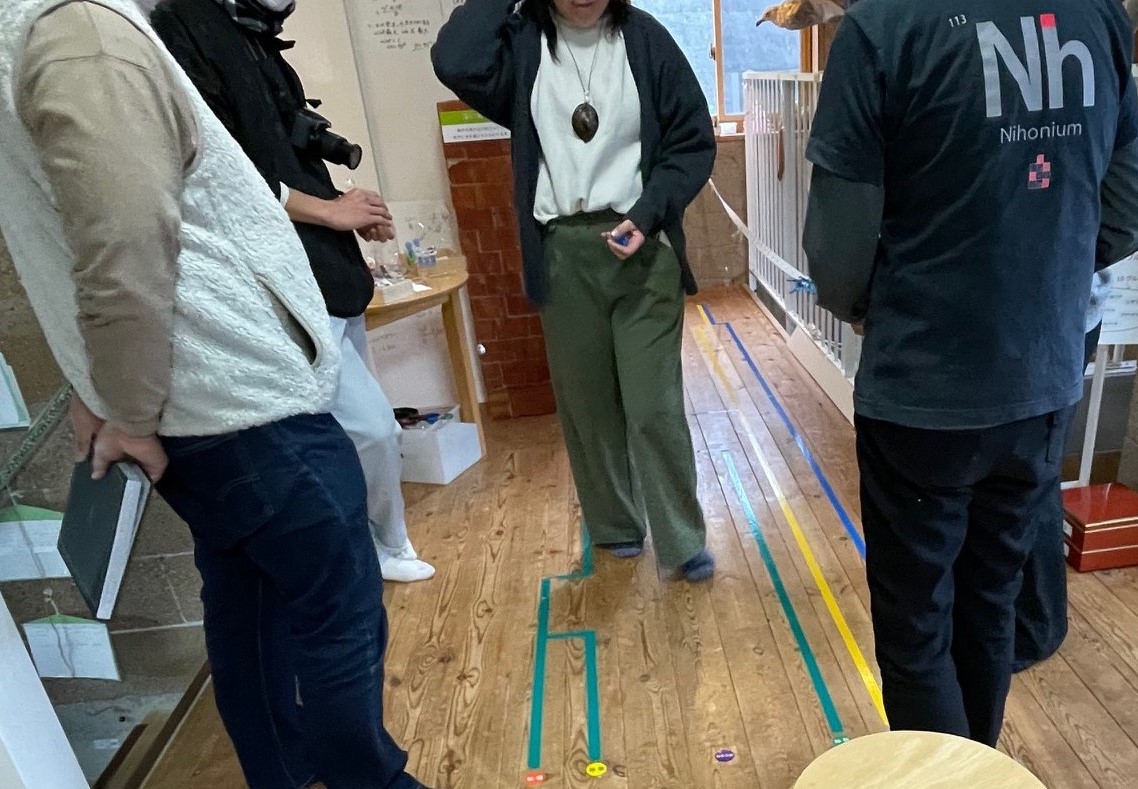 理科ハウスの床展示を囲んで、展示方法について意見交換。